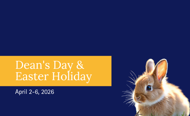 Please note that Thursday, April 2, is Dean’s Day, followed by the Easter holidays from Friday, April 3, to Monday, April 6.